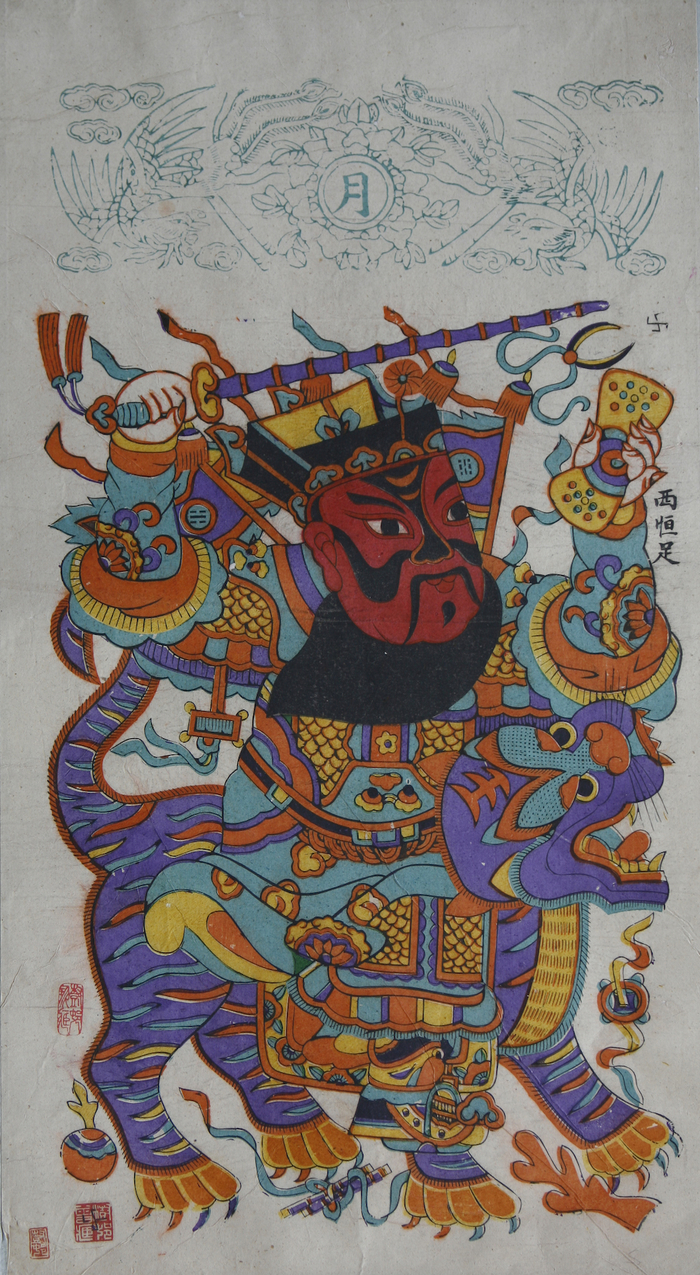 年画中的神佛仙人骑虎者,大抵为赵公明与张天师二人,此类年画中所体现的虎形象大多从属于赵公明或张天师等人物,经常被设置于画面下方或边角处,主要突出人物的刻画。前文已述作为门神的赵公明,但除门神中和燃灯道人搭配之外,赵公明还经常作为独立的“武财神”或“龙虎玄坛真君”的形象出现于民俗年画或纸马中。