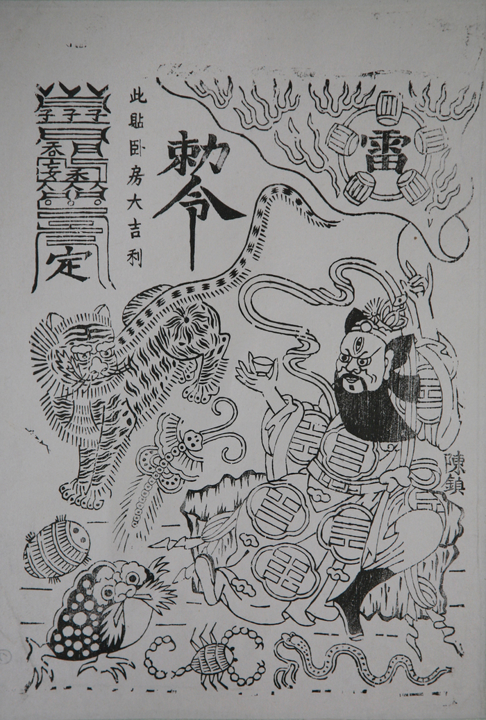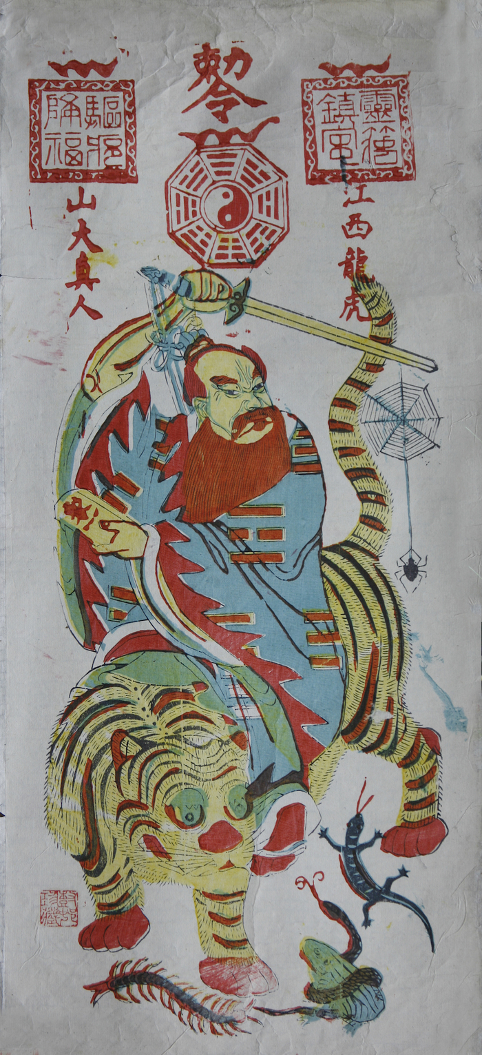 张天师是另一位年画中塑造较多的骑虎人物,其名陵,又名道陵,东汉沛国丰县人。东汉顺帝时创立道派,教人信奉,并以符箓咒法治病除灾,后裔继承其道法,世居龙虎山,被奉为天师。《岁时杂记》记载:“端午,都人画天师像以卖,又合泥做张天师。”又宋代刘松年的《耕织图》中画有一农家屋梁上贴一张天师作法状,得知张天师之图像在宋朝已很流行。民间信仰认为张天师有捉鬼除祟的法力,因而在端午节将其像张贴供奉,以除邪恶,保家宅平安。
