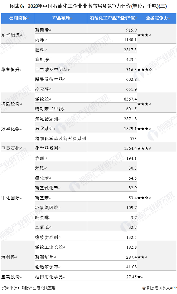 目前,布局了石油化工开采、冶炼、精密加工业务的上市企业中,、中石油、中石化在石油化工氧化物、石油化工聚合物等产品产量遥遥领先于其它企业。石油化工产业产业链上的其它代表性企业业务布局及竞争力情况如下: