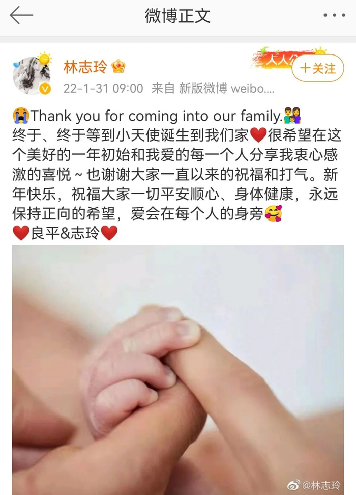 1月31日一早,知名女星林志玲发微博宣布生宝宝并晒出与小婴儿握手的照片,配文:终于、终于等到小天使诞生到我们家。