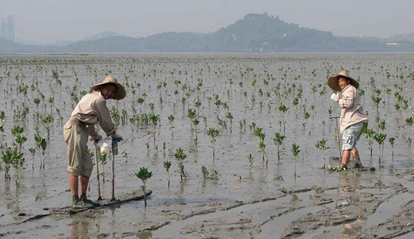 工人踩着泥马,正在滩涂上人工清除红树林幼苗,为水鸟觅食提供裸滩 © WWF-Hong Kong