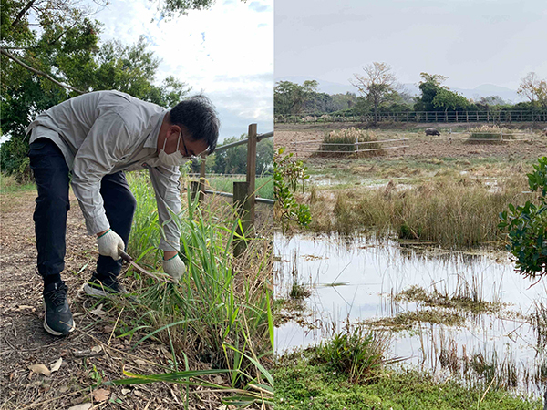 文博士正在为水牛割草(左); 水牛啃食过后多样的短草地湿地与围栏里自然生长的芦苇形成对比(右) 王婷 图