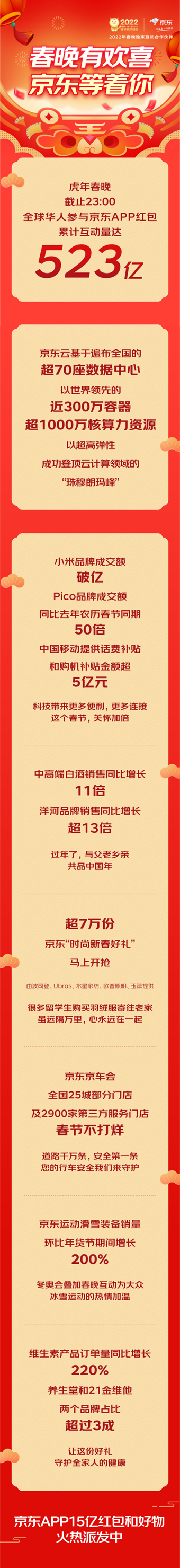 福虎贺岁,欢乐祥瑞。大年三十看春晚成为人们不可或缺的新年俗。今年,作为央视虎年春晚独家互动合作伙伴,京东在辞旧迎新、守岁纳福之际,送出15亿红包和实物好礼。从春晚开始至23点,全球华人参与京东APP红包累计互动量达523亿次。除夕当晚22点06分,春晚“摇一摇”互动送出的第一单实物奖品已经通过京东快递送到了贵州省毕节市消费者的手中。