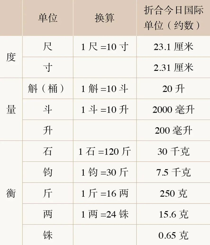 1尺长约29.5厘米, 1升约600毫升, 1斤约660克。——丘光明《中国古代计量史》