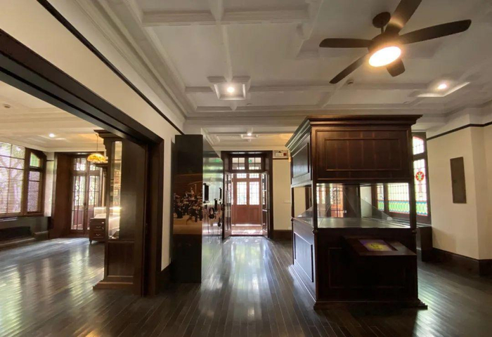 因功能转换,需结合各空间不同情况添加布置现代化设备。在空调新风方面,地柜式空调的外饰面采用与木门窗一致的木材质感,结合窗台、展柜等协调布置。新风排风则利用原壁炉烟囱、门上高窗等隐蔽位置灵活布置。修缮方采取多重手段相结合的方式,力求最大化还原历史建筑风貌。