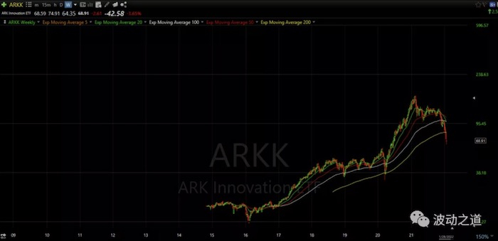 接受第一财经记者采访的美股交易员都表示,必须要慎待后市,并做好挥别12年美股大牛市的准备,甚至有交易员对标普500后市给出3800点的初步目标位。最危险的就是估值虚高、无持续盈利基础的科技股,资深美股交易员司徒捷对第一财经记者表示,“‘木头姐’的ARKK ETF直接跌破了200周均线。这其中最没有科技含量的就是所谓的居家健身股Peloton,目前股价已经回到了‘梦开始的地方’(疫情前的位置)。”