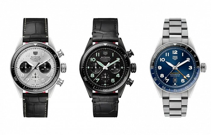 上图:两款全新计时码表(左一、左二)均搭载了获得瑞士官方天文台认证的品牌自制 Calibre Heuer 02飞返计时机芯,这是泰格豪雅首次将飞返功能引入 Autavia 系列,该功能可在无需停止当前计时的情况下便重置计时指针以开启重新计时;而两地三针腕表(右)搭载了获得瑞士官方天文台认证的 Calibre 7 两地时机芯,是该系列首次引入两地三针技术。