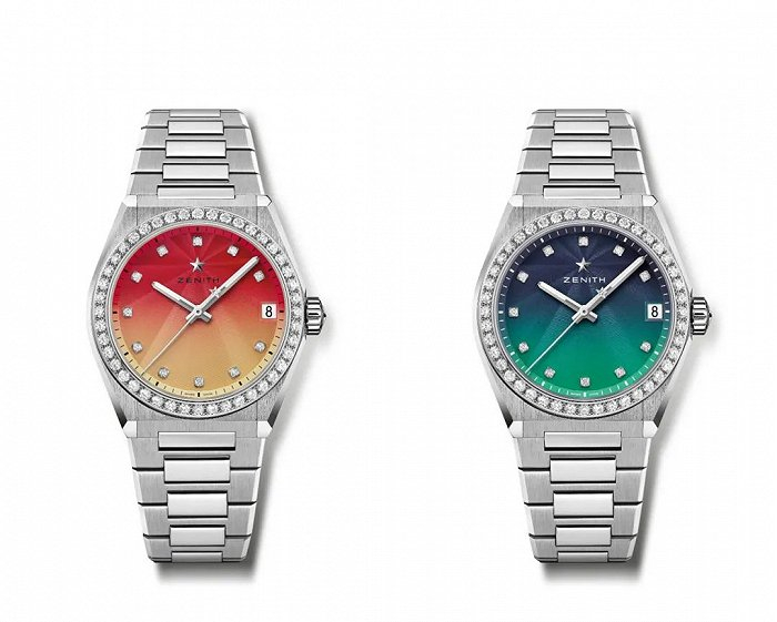 2020年,真力时推出了首款专为女性量身定制的DEFY系列腕表。该系列以品牌的核心要素“星空”为灵感,旨在为女性打造一款多用途的运动时尚腕表。而在本次钟表周上,该系列再添两款新品——DEFY MIDNIGHT Sunset 腕表和 DEFY MIDNIGHT Borealis 腕表,分别以日暮和北极光为色彩灵感,一改传统表盘的黑白灰风格,使表盘色彩更加丰富。