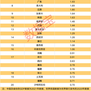 按照GDP数据和2021全年人民币平均汇率计算,广东省GDP约合1.93万亿美元。与世界银行发布的各国2020年GDP数据相比,广东以一省之力超越意大利、加拿大,排名世界第8位,经济水平直逼法国,相当于5个阿根廷。