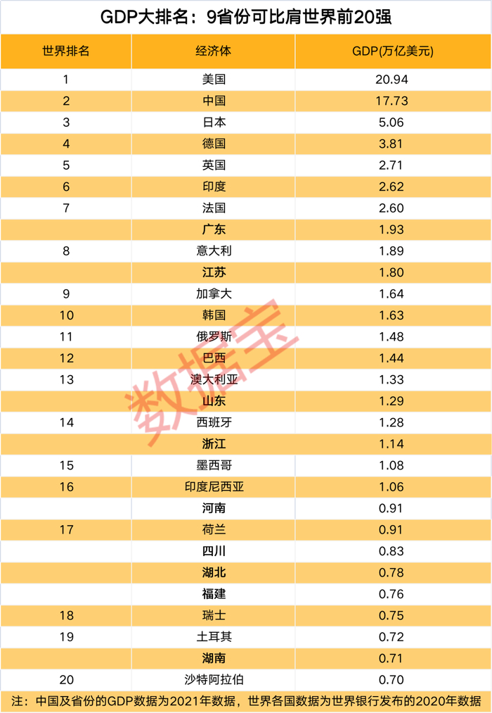 放置在全球坐标系中,我国有9个省份的GDP可比肩世界前20强,排名国内第九名的湖南GDP达到0.71万亿美元,超越2020年世界第20位的沙特阿拉伯(0.70万亿美元)。