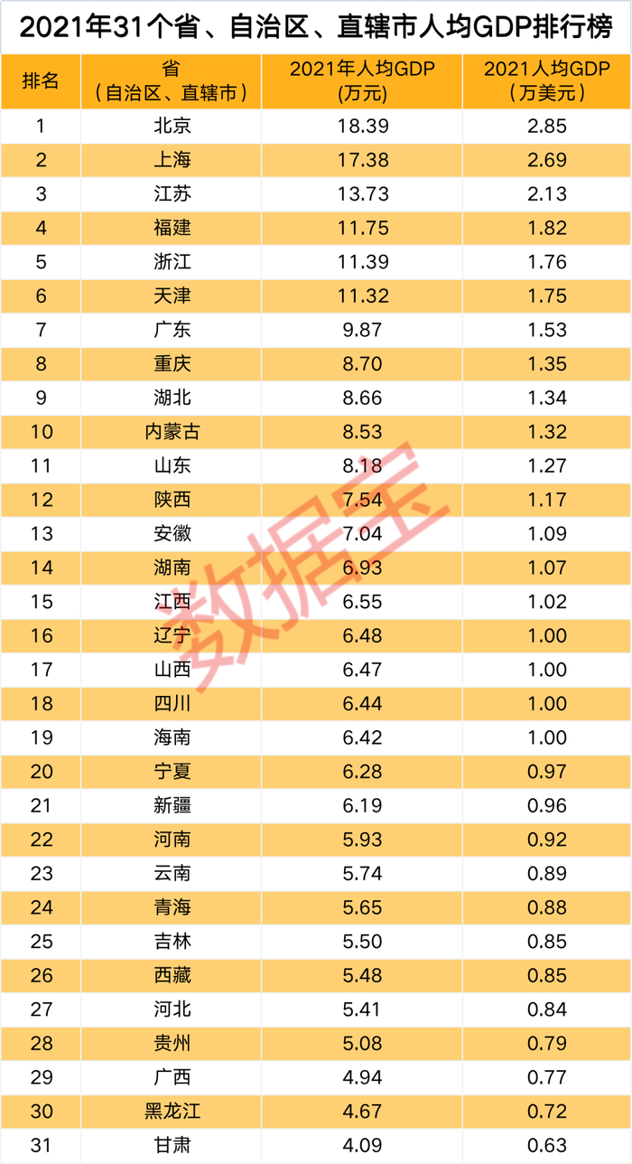 北京继续位居全国第一,达到2.85万美元,接近3万美元,超过了世界上很多国家,包括一些欧洲国家例如葡萄牙等。但与发达国家相比,还有一定的距离。一般来说,在不考虑科技、教育、人文和发展指数等指标的情况下,人均GDP超过3万美元,意味着达到发达国家水平(韩国、意大利等中等发达国家人均GDP在3万美元以上)。继北京、上海人均GDP超过2万美元后,江苏2021年人均GDP达到2.13万美元。