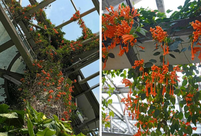 走进上海植物园一号展览温室,18米高空的长廊一片火红,因为该温室的炮仗花迎来近20年花量最大一次的花期。