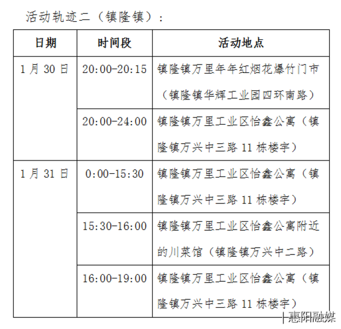 2月1日凌晨,仲恺通报一名涉深圳密接者,两名次密接者活动轨迹,轨迹涉及陈江惠环及潼侨。
