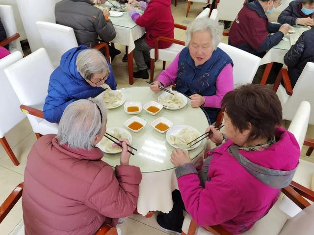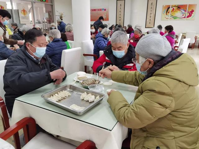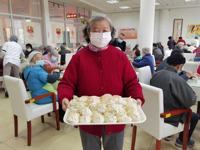 在食堂中,早已欢声笑语,40余位老年人分坐十几桌,一起动手包饺子。今年78岁的徐蓓芬老人是地道的上海人,很擅长包月牙饺子,她将饺子皮托在掌心,放入适量的饺子馅,然后从底部开始,一点点的往前捏,手法均匀一致,几秒钟一个完整的水饺就包好了。“这个饺子的形状四平八稳,可以煮着吃也可以蒸着吃,南方人喜欢吃锅贴,也可以煎着吃,这个样式的水饺可以有多种吃法。”徐蓓芬说。