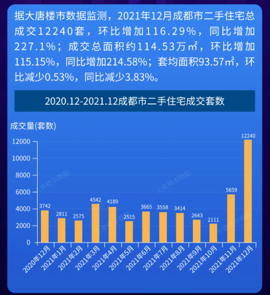 据大唐楼市数据监测,2021年12月成都市二手住宅总成交12240套,环比增加116.29%,同比增加227.1%;成交总面积约114.53万平方米,环比增加115.15%,同比增加214.58%;套均面积93.57平方米,环比减少0.53%,同比减少3.83%。2020年12月以来,成都二手房成交套数普遍在4000套以内,仅2021年11月成交超过5000套(5659套),10月份成交量最低(仅2111套)。