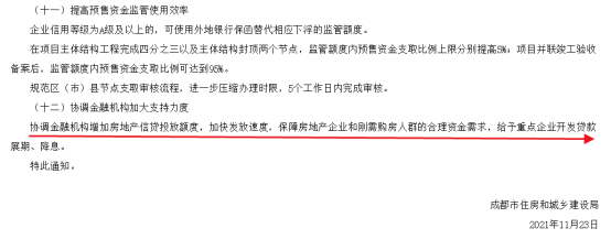 2021年11月,成都市发布《关于精准应对疫情冲击全力实现年度目标的通知》明确指出:“协调金融机构增加房地产信贷投放额度,加快发放速度,保障房地产企业和刚需购房人群的合理资金需求,给予重点企业开发贷款展期、降息。”