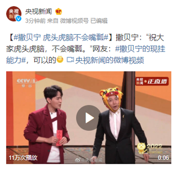 接着#撒贝宁嘴瓢# 登上热搜,随后他就在春晚舞台上自己回应热搜,“祝大家虎头虎脑,不会嘴瓢。”