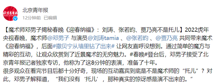 历年央视春晚除了歌舞、语言类等节目外,魔术也是观众最期待的节目之一。2022虎年央视春晚,魔术师邓男子与演员刘涛、张若昀、贾乃亮共同带来魔术《迎春纳福》。