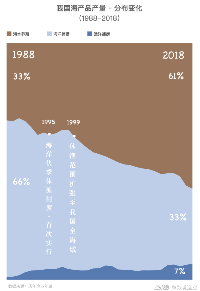根据我国30年间海产来源的分布变化可以看到,近三十年来我国海产品产量中海洋捕捞占比持续下降,海洋养殖、远洋捕捞持续上升,这其实是我国针对近海渔业资源日渐衰退,而作出的战略性调整的成果。