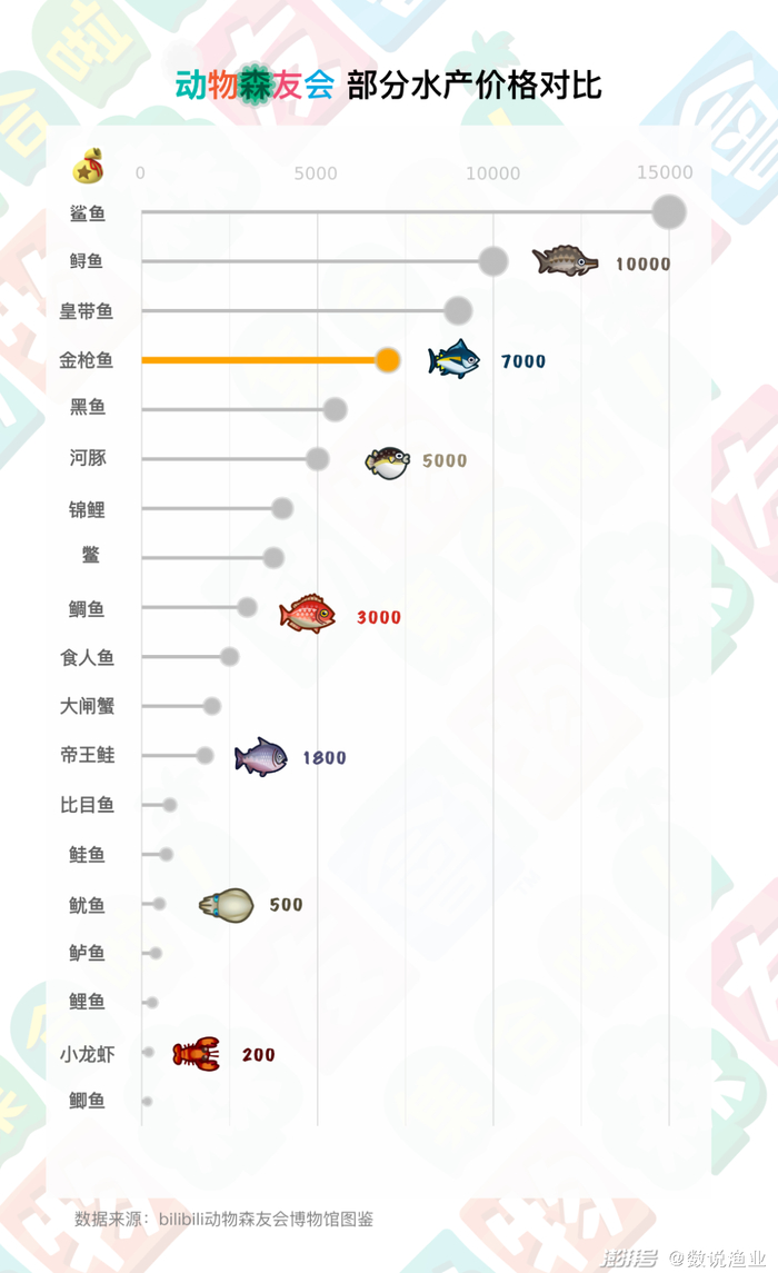 动森中的鱼类价格也在一定程度上反映了现实世界中它们的相对价值,下图展示了一部分我们比较熟悉的品种(不仅限于海产)。