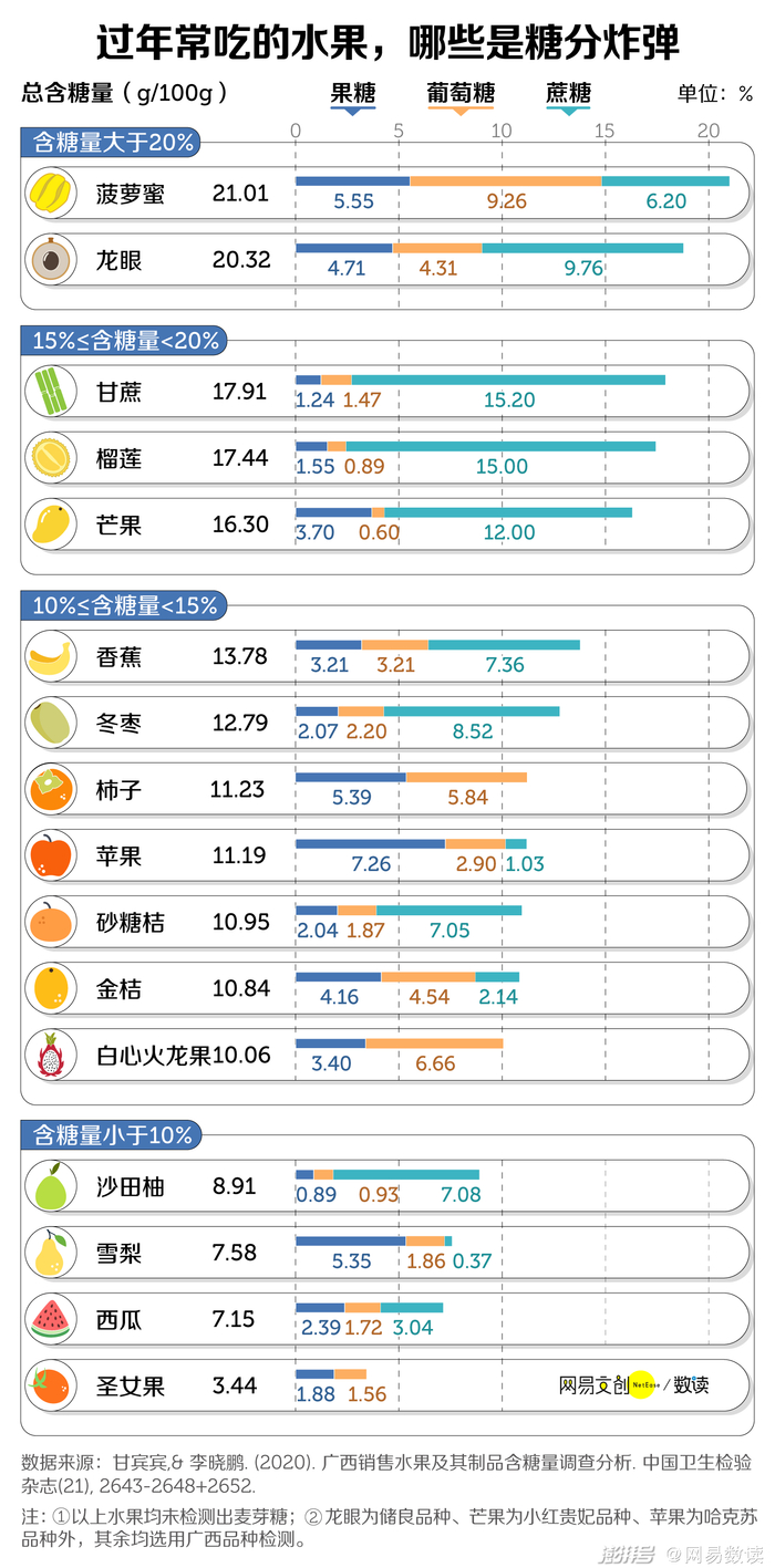 虽然含糖量超过15% 的大多是热带水果,并非家家户户过年时都常吃,但寓意美好、春节常出现的龙眼(桂圆),含糖量就超过了20%,绝对应该进入一级警戒名单。