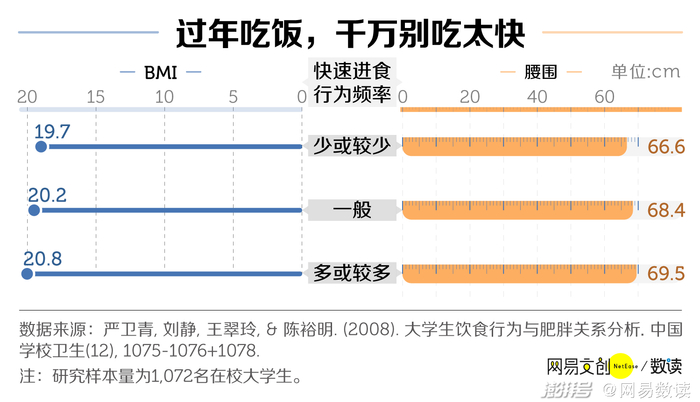 一项针对1000多名中国大学生饮食习惯和肥胖关系的研究也表明,吃得慢的人确实会更瘦一些,他们的 BMI (体重指数)平均会比进食速度快的人低1个点,腰围也会平均细3cm。