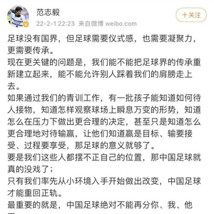 而对于这场失利,范志毅赛后第一时间也写下了这样一段话——“中国足球绝对不能再分你、我、他了”。