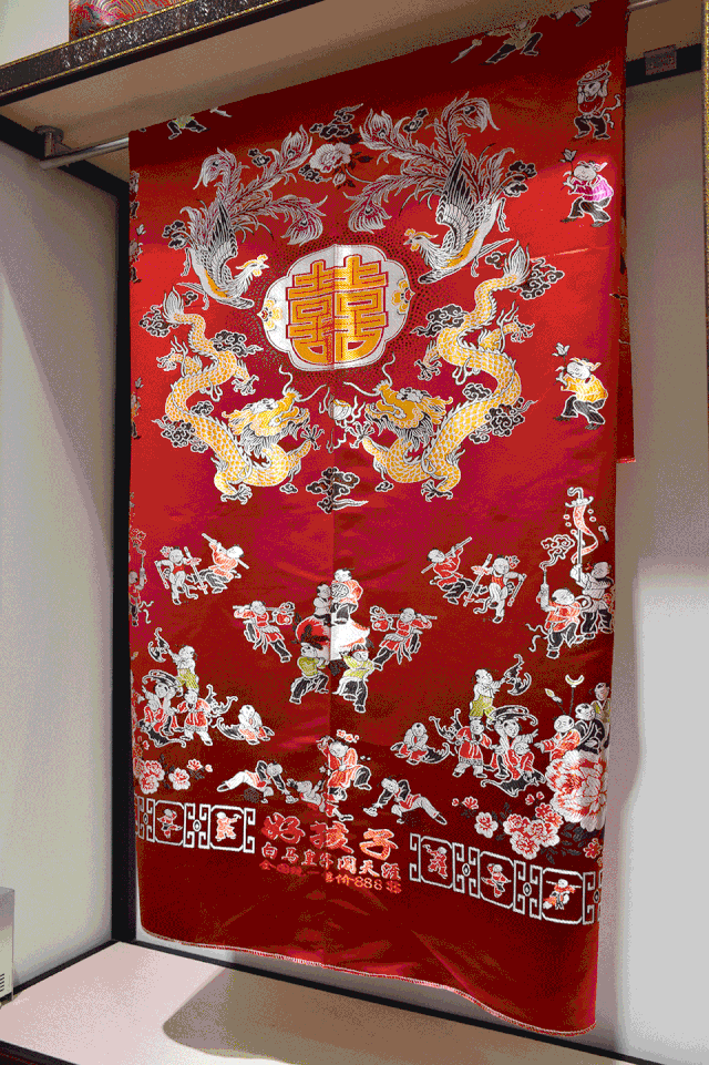百子图被面上织有100个“小官人”嬉戏游玩,神态各异、栩栩如生,寓意子孙昌盛、阖家美满、多福多寿。