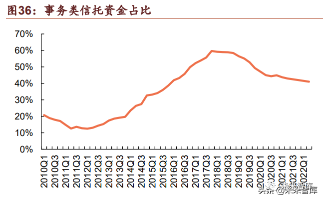 数据选择:使用用益信托网及信托业协会公布公开数据估算。计算假设:①信托资金利息按用益信托网公布的平均收益率+2.2%管理费计算;②信托利息按年计算每季度平均支付;③由于非主动管理信托资金已在信托贷款 内含括,为避免重复统计,将在信托资金内剔除该部分资金,主动管理类信托资 金占比 = 1 – 事务类信托资金占比。