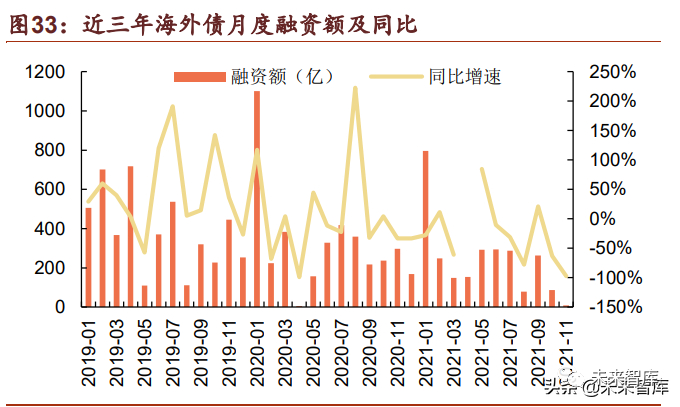 进入 2021 年,房企频繁出现海外债务违约,导致海外债新发行受阻,前三季度累 计融资额 2565 亿,同比减少 32%。10 月单月同比增速为-63%,融资额仅 88 亿 元。11 月单月融资额下行至 8 亿人民币,同比减少 97%。