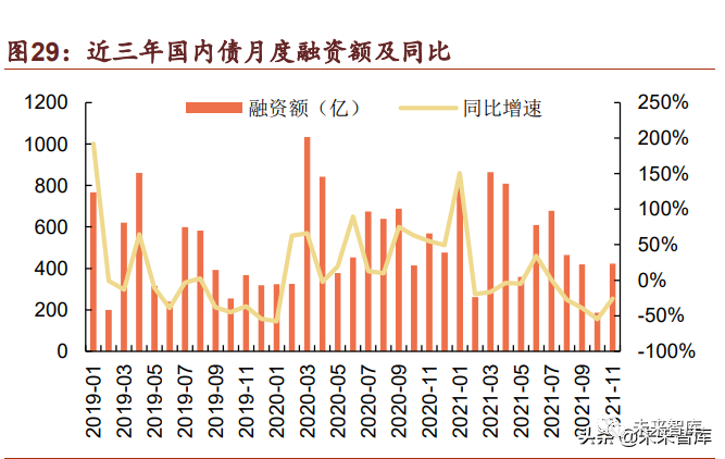 当前状态:2021 年三季度国内债券市场融资出现较大幅度下滑。从历史来看,国 内债券融资规模从 2015 年快速提升,2018 后规模维持相对稳定,2020 年全年融 资额 6816 亿元,同比增长 24%,截止至今年 11 月累计融资额 5888 亿,同比减少 7%。从月度数据来看 2021 年上半年整体融资额同比呈正增长,进入三季度债券 融资金额快速下降并于 10 月达同比增速最低点-55%,11 月回升至同比增速-26%。