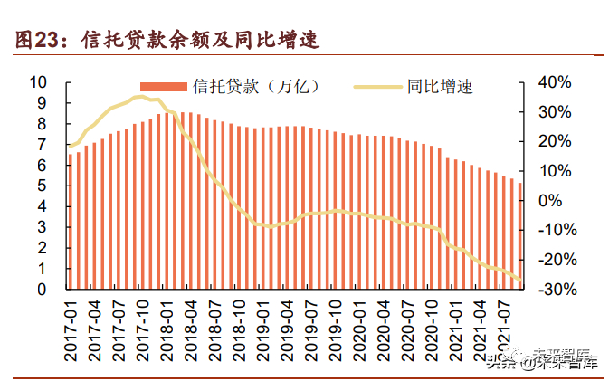 当前状态:依据我们的测算及用益信托网数据,2021 年 1-11 月新增信托融资额 5731 亿,同比减少 32%。2021 年下半年部分民企暴雷,对信托资金融资造成较 大冲击,10 月份单月新增信托融资仅 163 亿,同比下降 50%,进入 11 月信托融 资金额单月同比增速进一步下行至-70%,但融资额回升至 242 亿。