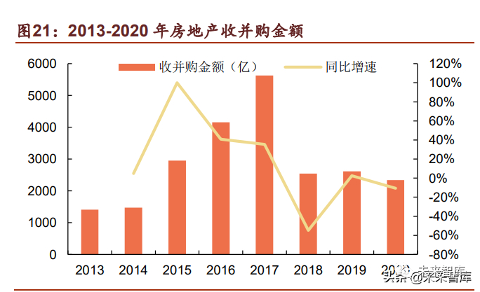 并购贷:并购贷是指银行向并购一方发放用于并购交易的贷款,并购贷既可用于 项目层面收购也可以用于股本权益交易。当前并购贷期限一般不超过 7 年,也需 满足“四三二”要求,且要求并购交易款中并购贷占比不超 60%,不得用于交付土地 出让金。我国房地产行业收并购总金额在 2017 年达到峰值,随后 2018-2020 年持 续维持在较低水平,若按实际并购贷款金额上限,即交易金额 60%为并购贷款计 算,2020 年房地产行业并购贷规模约 1403 亿。