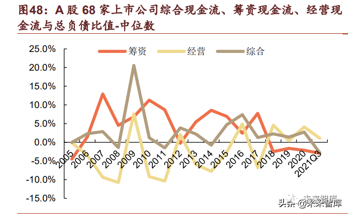 从企业层面 A 股上市公司筹资与经营现金盈余水平来看,筹资端资金流出扩大, 是本轮行业资金紧张的特征,与我们前述得到的结论基本一致。2008、2011、 2014 年行业资金紧张期间,以经营端承压为首要原因,而筹资端资金保持在高位。2021 年三季度则呈相反态势。
