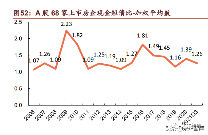 房企现金短债比 2021 年三季度呈下行态势,加权平均数由 2020 年末 1.39 下行至 1.26,短期偿债压力有所提升。这一现象反映了当前房企资金流入减少,筹资端 流出,在手现金持续用于偿还债务的情况。但从历史来看,行业整体的短期偿债 能力仍好于 2008、2011、2014 年。