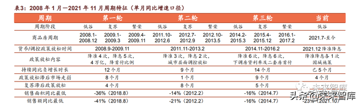 政策干预时点与力度对行业复苏的时间影响较大:第一三轮低谷期相对长, 而第二轮低谷期较短,主因为一三轮周期中政策干预明显晚于第二轮周期;另一方面第一三轮政策调控放松幅度较第二轮周期更大,政策放宽后市场实 现快速复苏,也因此第一三轮周期市场未出现长期负增长的原因。