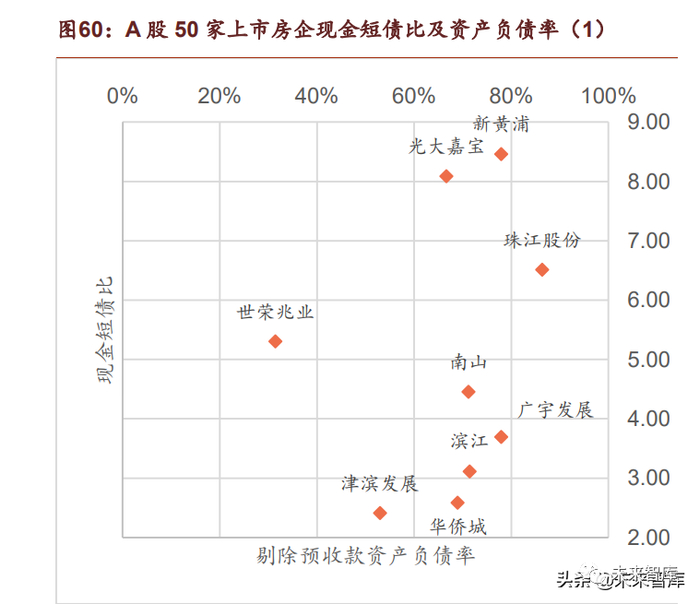 50 家房企中,14 家房企剔除预收款资产负债率在 70%以下,房企的中长期偿债压 力更高:其中资产负债率较高的房企为天房、泰禾、蓝光、中交、天地源、阳光城等;新湖中宝、苏高新、福星股份、津滨发展、招商等房企资产负债率较低。品牌房企的资产负债率主要分布于 70%上下,其中偏高的是新城、中南、绿地、 阳光城。综合来看,70-80%的剔除预收款的资产负债率的房企有 25家,是房企分布密集 区,60%以下的房企仅 5家,占比较低,房企的中长期杠杆去化压力持续存在。