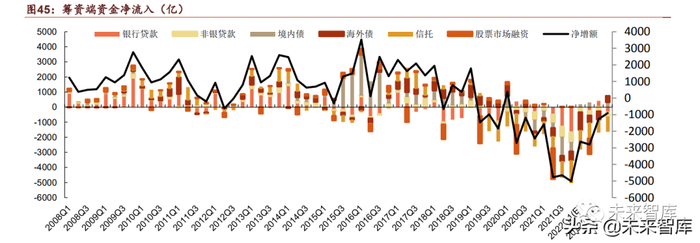 从筹资端流入来看,通过对于各项标准化的资金渠道的本息流出计算,我们发现各大资金渠道均有较大的资金流出压力。我们将主要的六类筹资通道净融资额按 季度罗列,可以发现,以 2019 年为界,各类融资通道的净融资额陆续转负,而 2008、2011、2014 年行业净融资额均为正值。