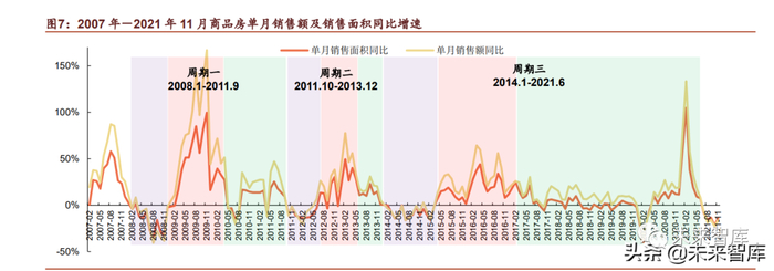 ①低谷期(2014.1-2015.3):房地产库存增加,经济增速下行,单月销售额 连续 10 个月同比增速为负,销售面积连续 13 个月同比增速为负;