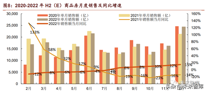 综合上述观点,我们认为政策力度相对有限,对市场承托力度与第二轮相当,市 场下行期仍将持续 7-8 个月,在 2022 年 6-7 月完成销售额同比增速由正转负,政 策“托而不举”,即使在 2021 年下半年低基数效应下,2022 年下半年销售额同比 增速仍难超越过往几轮复苏期水平,预计 2022年年底销售额同比增速回升至 15%。