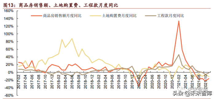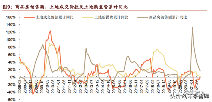①土地成交价款受市场销售表现及融资环境共同影响,当期土地购置费由成 交土地当期支付额及过往成交土地本期支付余款组成:通过比对三者累计同 比增速可以发现,商品房市场上行或下行带动土地成交价款变化,而土地购 置费与土地成交价款在 2012 年前同比走势基本一致,随着土地款分期支付占 比逐步提高,土地购置费的变化速度明显滞后于土地成交价款且时滞逐渐拉 长,商品房销售额、土地成交额以及实际土地款支付金额的走势分化。