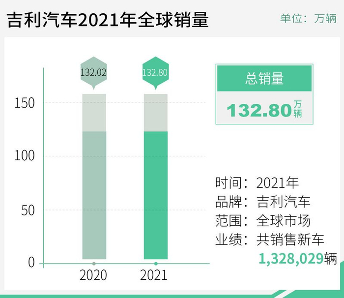 凭借着强势的市场表现,吉利汽车毫无悬念地摘得中国品牌年度销量第一的桂冠。吉利汽车2021年总销量达1,328,029台,同比去年微增1%。