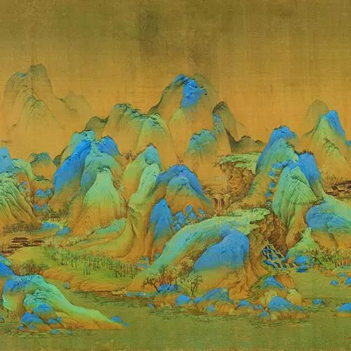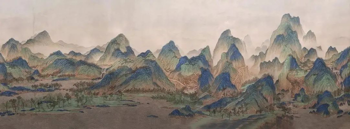 【按住图片左右滑动可看全图】王希孟《千里江山图》,绢本青绿设色,纵51.5厘米、横1191.5厘米,北京故宫博物院藏