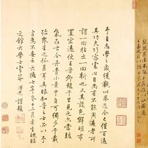 浦光圆寂后,该图易主,但是整个明代这幅画在谁手中至今都不得而知。直到清初,藏书家、文学家梁清标将其收入囊中,他的很多朋友也见过此画,之后就被收入清宫内府,著录在乾隆时期《石渠宝笈·初编》中。乾隆在画上题诗又盖印,留下了很多痕迹,又派了两名宫廷画师临仿,可见他的喜爱非同一般。