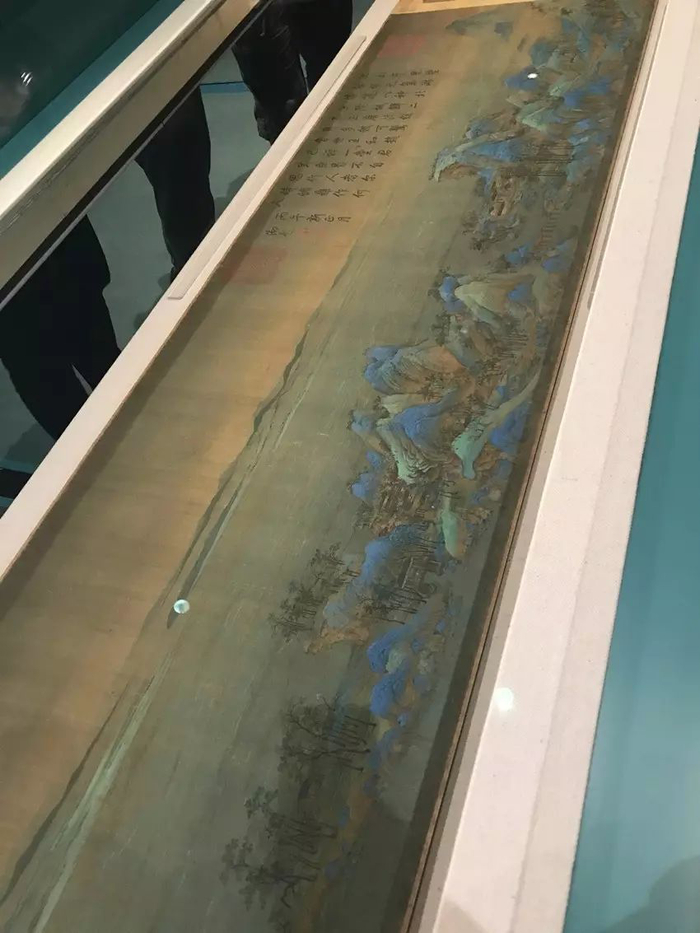 上世纪50年代、80年代,1999年和2013年,这幅画曾四次公开展出过。在以往的几次展览中,由于展陈条件有限,作品都只是部分打开。由于这次特殊的展览,故宫为《千里江山图》定制了新的展柜,使这件作品首次全卷打开,以全貌展现在公众面前。