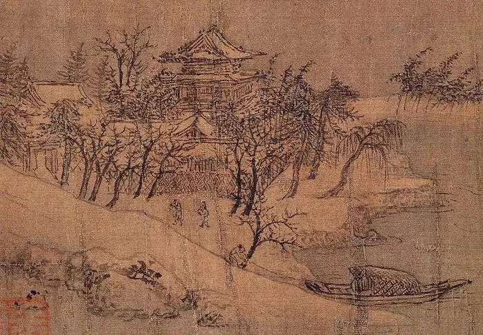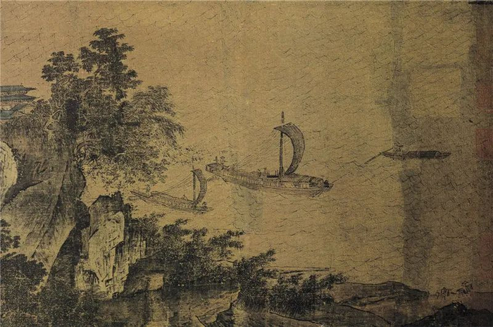 约1110年,宋徽宗完成了《雪江归棹图》,描绘冬日的寒江雪色,有“李郭”山水画的影子,这也是现存宋徽宗唯一一幅山水图卷。从《千里江山图》的山石走势来看,王希孟想必是见过徽宗这幅山水图的,以传统的散点透视法,略带俯视的角度横向展开一幅全景式大山大水。余辉认为王希孟在《雪江归棹图》的构图基础上进一步拓展了山脉的走向,“全卷群山绵延,远近高低各不同,若即若离,变化丰富而不凌乱”。