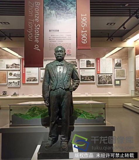 在詹天佑铜像前,一位记者正在细心拍摄。“1905—1909年,詹天佑主持修建中国自主设计并建造的第一条铁路——京张铁路。”他自豪地告诉记者,100多年后的今天,京张高铁已经投入使用,京张高铁是中国第一条采用自主研发的北斗卫星导航系统、设计速度350千米/小时的智能化高速铁路。
