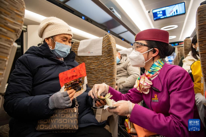 林梦凡(右)在成渝高铁智能复兴号“共青团号”列车上为购买小食品的老年旅客提供零钞找现服务(1月27日摄)。