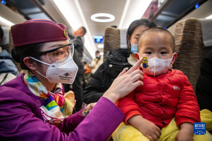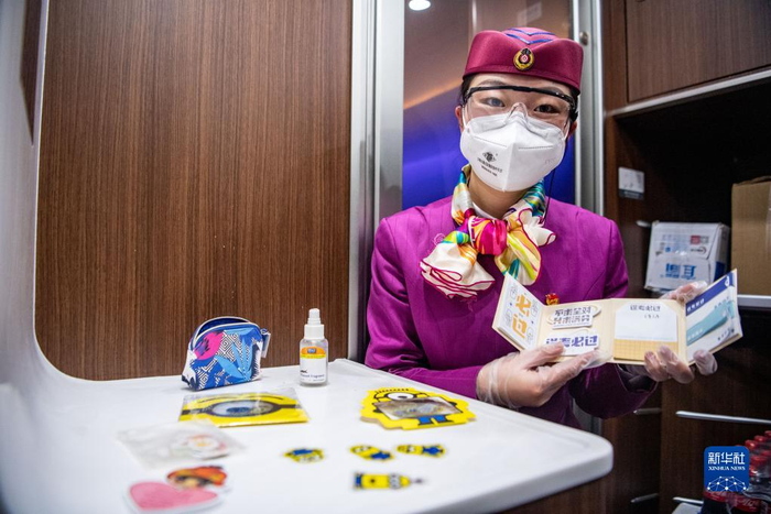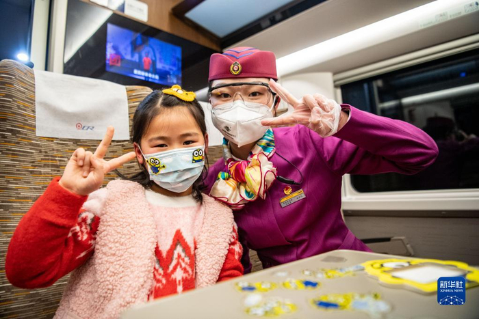 林梦凡(左)在成渝高铁智能复兴号“共青团号”列车上给小朋友的口罩贴上卡通贴纸(1月27日摄)。