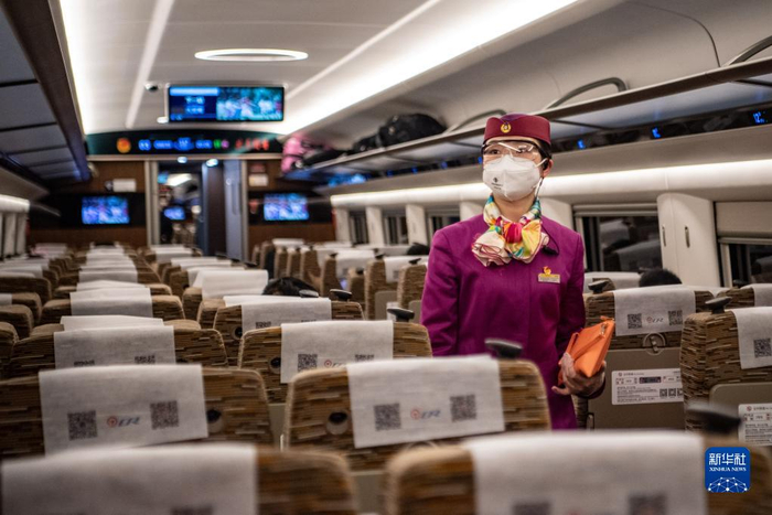 林梦凡在成渝高铁智能复兴号“共青团号”列车上工作(1月27日摄)。